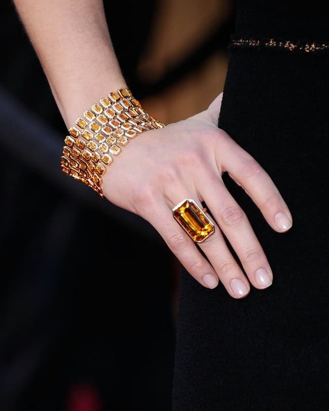 Отлично будут смотреться золотые серёжки, кольца и браслеты с большими камнями. Эффектно будет смотреться дорогостоящая бижутерия с необычным дизайном.